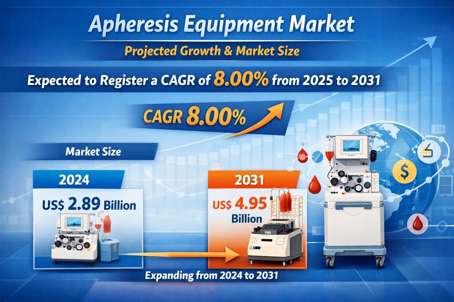 The Apheresis Equipment Market is poised for steady expansion, with a projected CAGR of 8.00% during 2025 to 2031. The industry is expected to grow from US$ 2.89 billion in 2024 to US$ 4.95 billion by 2031, reflecting increasing demand for advanced blood component separation technologies across healthcare settings. The growing prevalence of chronic disorders, rising awareness about blood donation and transfusion safety, and advancements in extracorporeal therapies are key contributors to this growth trajectory.