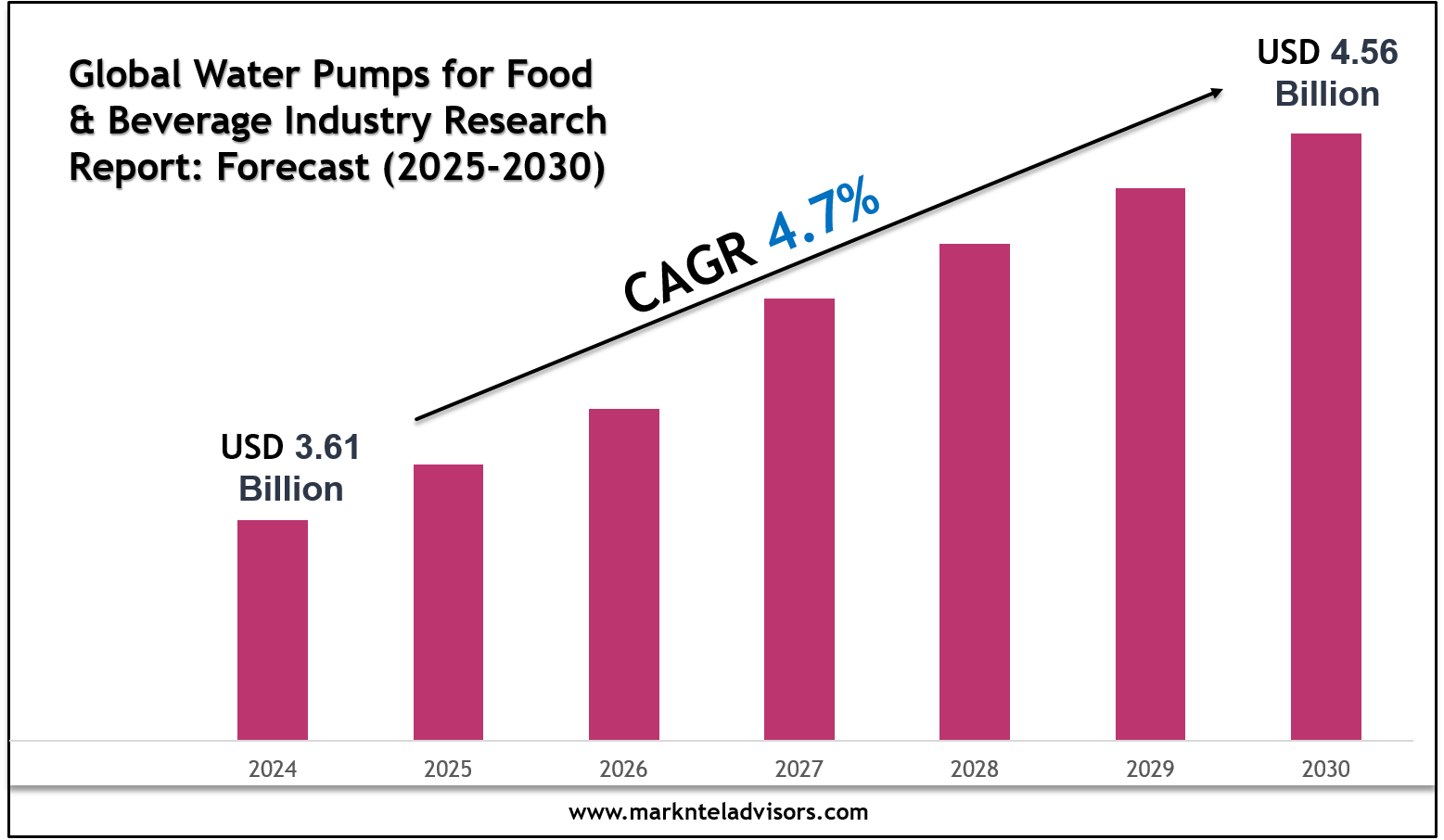 The Global Water Pumps for Food & Beverage Industry size was valued at around USD 3.61 billion in 2024 and is projected to reach USD 4.56 billion by 2030. Along with this, the market is estimated to grow at a CAGR of around 4.7% during the forecast period, i.e., 2025-30.