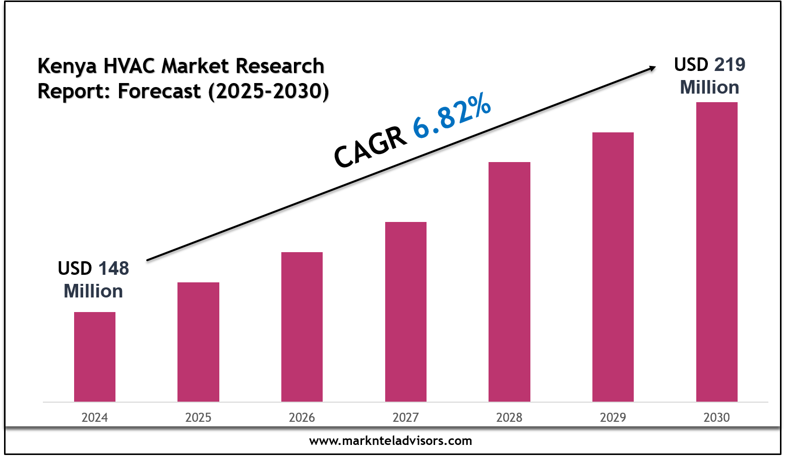 As per MarkNtel Advisors the Kenya HVAC Market size was valued at around USD 148 million in 2024 and is projected to reach USD 219 million by 2030. The market is also estimated to grow at a CAGR of around 6.82% during the forecast period, i.e., 2025-30.