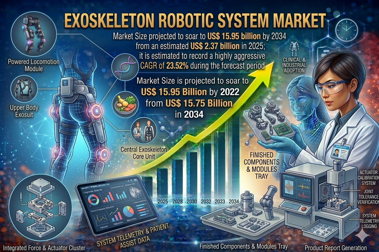 The global exoskeleton robotic system market is entering an era of extraordinary expansion. According to a comprehensive market intelligence report by The Insight Partners, the sector is projected to surge from US$ 2.37 billion in 2025 to an impressive US$ 15.95 billion by 2034, registering a highly aggressive CAGR of 23.52% during the forecast period of 2026–2034. This remarkable trajectory reflects the convergence of advanced robotics, artificial intelligence, and escalating demand across healthcare, industrial, and defense sectors worldwide.