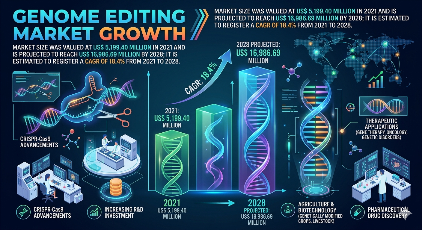 Market analysis indicates that the global genome editing market is on a steep upward trajectory. According to data from The Insight Partners, the market was valued at US$ 5,199.40 million in 2021 and is projected to reach US$ 16,986.69 million by 2028. This growth is underpinned by a robust Compound Annual Growth Rate (CAGR) of 18.4%. As we look toward the 2034 horizon, this momentum is expected to be sustained by the transition of CRISPR-based therapies from experimental clinical trials to mainstream commercial availability.