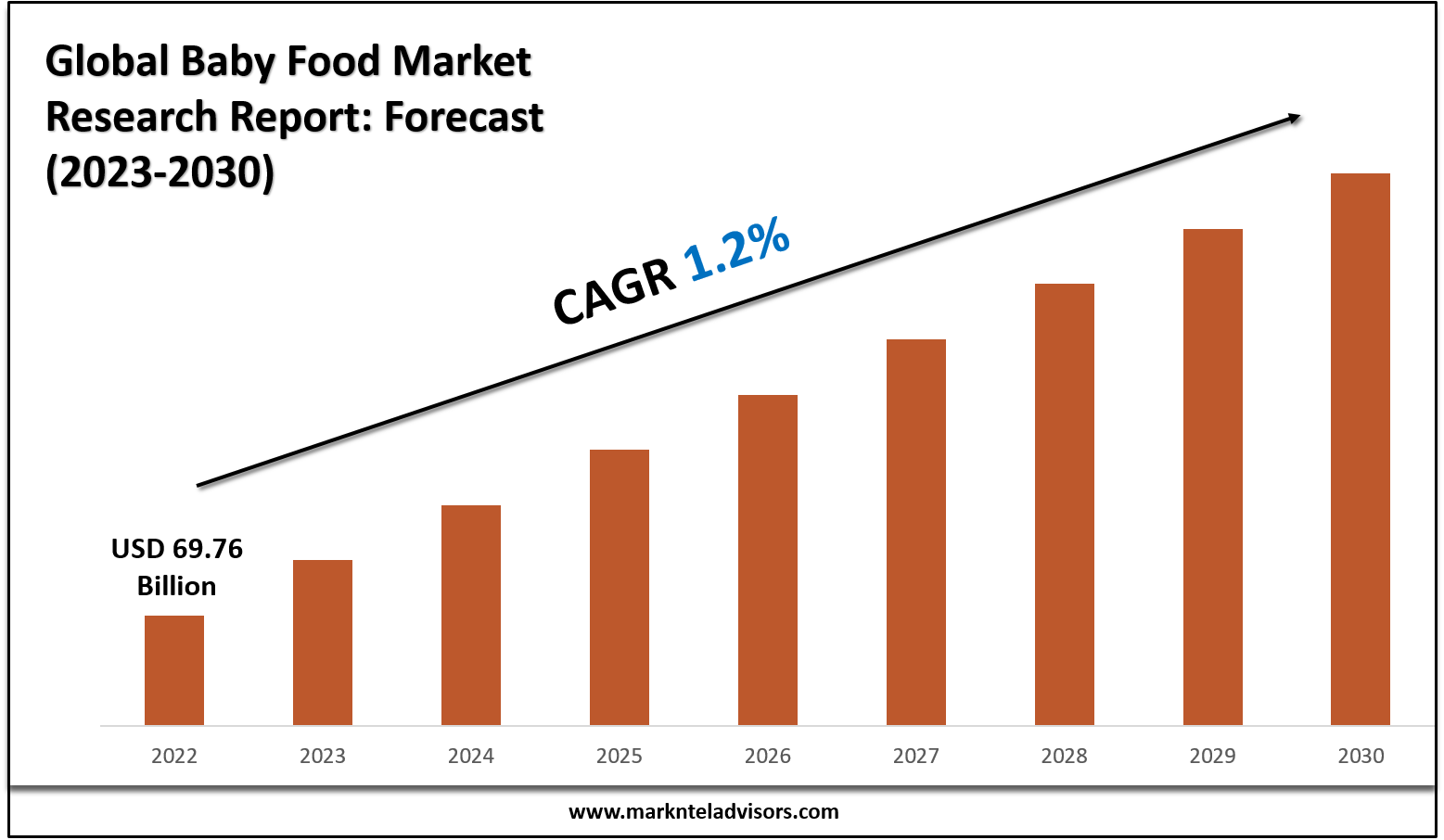 The Global Baby Food Market size was valued at USD 69.76 Billion in 2022 and is projected to grow at a CAGR of around 1.2% during the forecast period, i.e., 2023-30. The market growth ascribes primarily to the increasing infant population, the rising awareness among parents about the nutritional requirements of babies, and the growing per capita income of people. The increasing number of working women has a direct impact on the market dynamics. As more women join the workforce, the demand for convenient & ready-to-use food products is increasing and, in turn, fueling the overall market growth for baby food.
