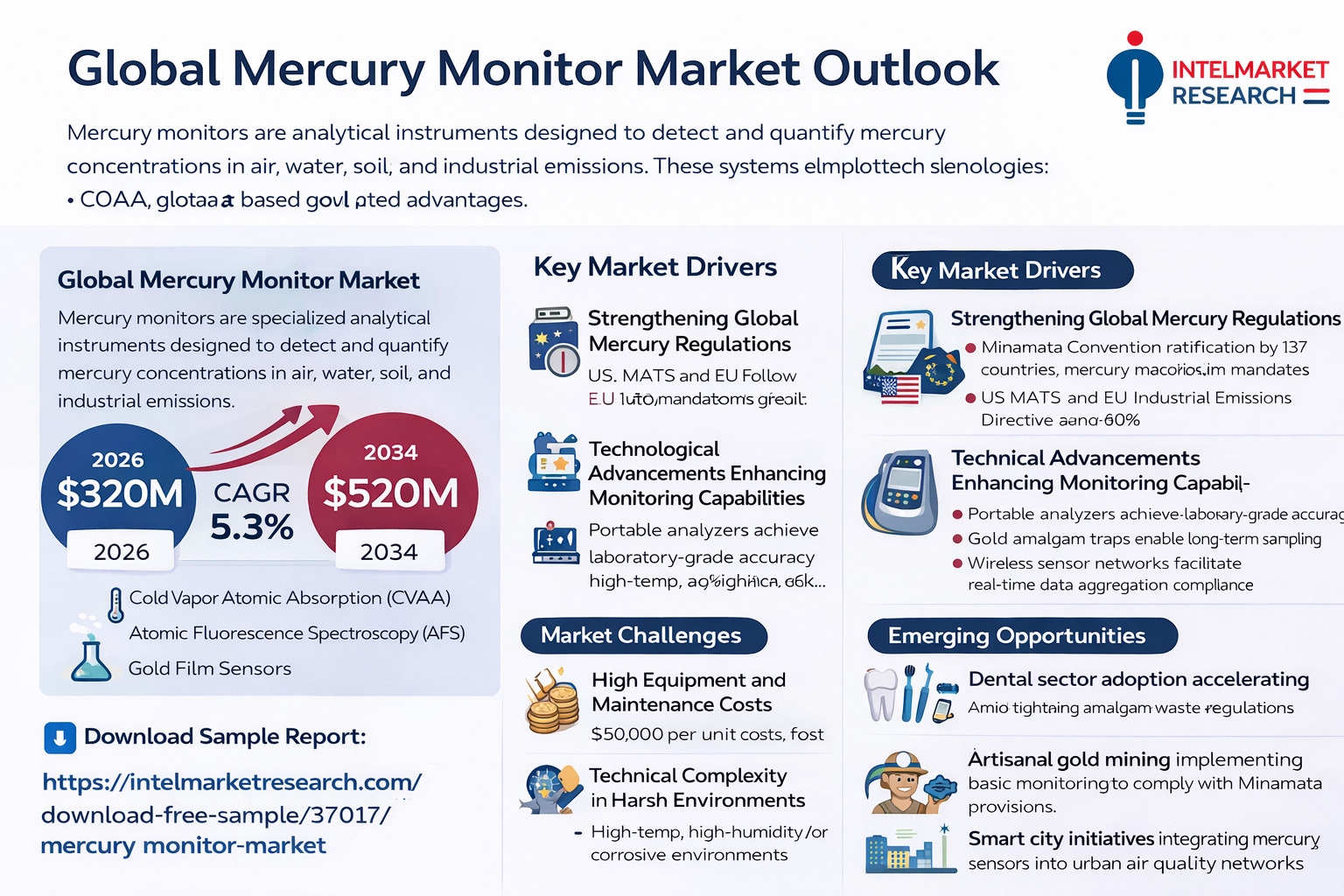 According to a new report from Intel Market Research, Global Mercury Monitor market was valued at USD 320 million in 2025 and is projected to reach USD 520 million by 2034, growing at a steady CAGR of 5.3% during the forecast period (2026–2034). This growth trajectory reflects tightening environmental regulations worldwide and increasing adoption across industries requiring precise mercury detection.