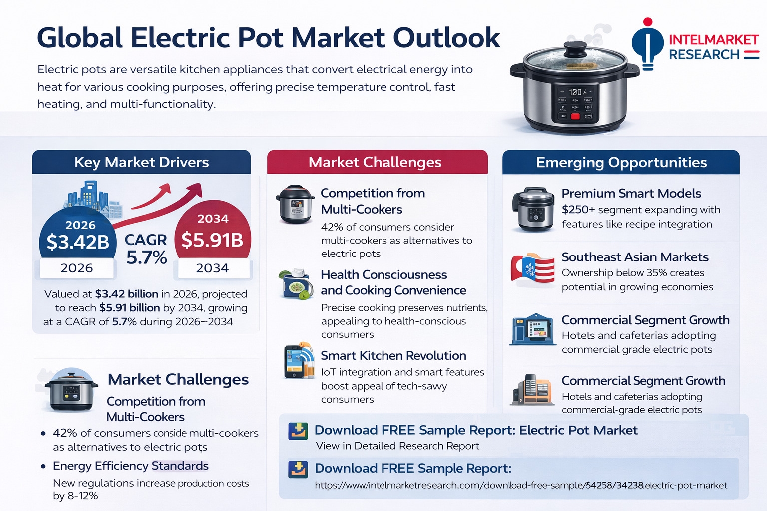 According to a new report from Intel Market Research, Global Electric Pot market was valued at USD 3.42 billion in 2025 and is projected to reach USD 5.91 billion by 2034, growing at a steady CAGR of 5.7% during the forecast period (2026–2034). This growth is propelled by increasing urbanization, rising demand for smart kitchen appliances, and technological advancements in electric cooking solutions.