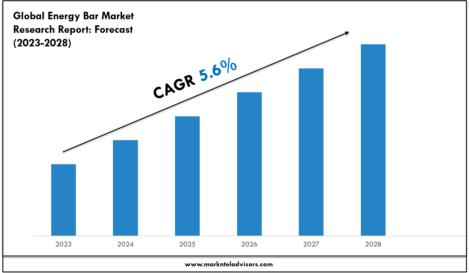 As per MarkNtel Advisors the Global Energy Bar Market is projected to grow at a CAGR of around 5.6% during the forecast period, i.e., 2023-28.