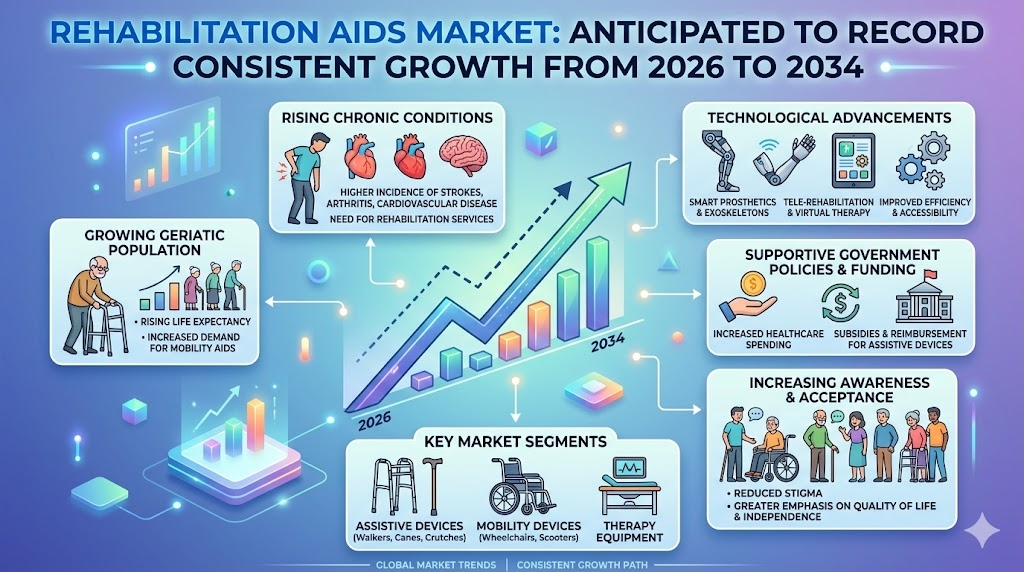 The Rehabilitation Aids industry is rapidly evolving as technological innovation and patient-centric care reshape the landscape of rehabilitation services. These aids, including mobility devices, therapy equipment, and daily living support tools, are critical for improving patient recovery, independence, and overall quality of life. Over the forecast period from 2026 to 2034, the industry is expected to witness significant growth as new trends and innovations drive adoption across hospitals, rehabilitation centers, and home care settings.