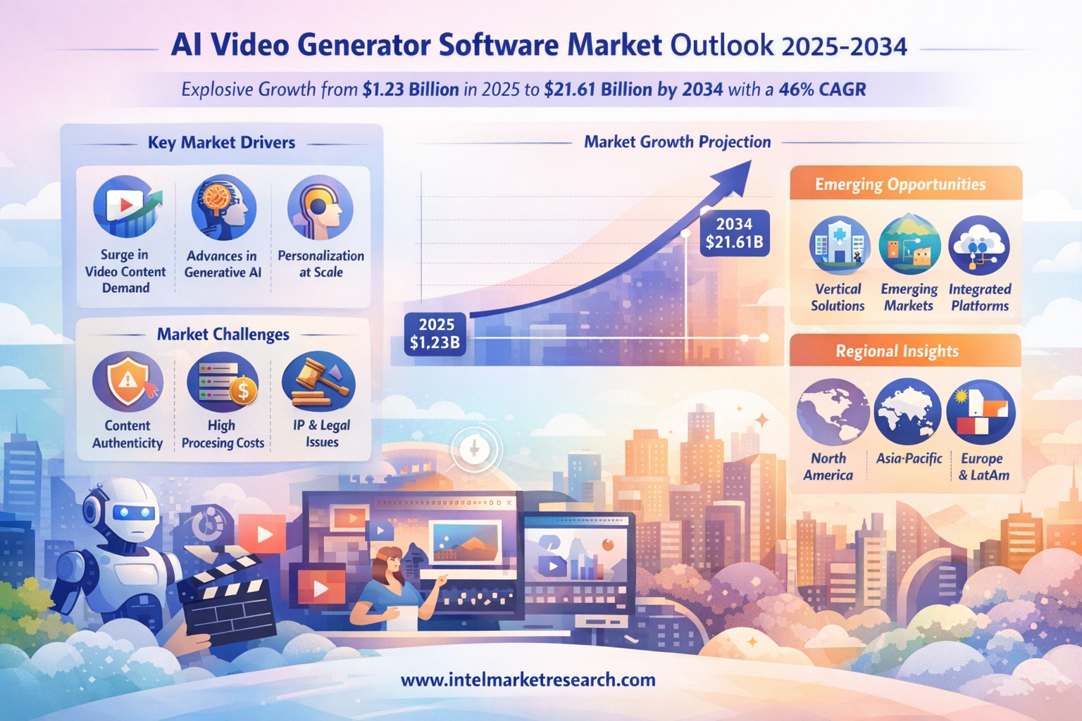 According to a new report from Intel Market Research, the global AI video generator software market was valued at USD 1.23 billion in 2025 and is projected to reach USD 21.61 billion by 2034, growing at an astounding CAGR of 46.0% during the forecast period (2025-2034). This explosive growth is driven by the surging demand for automated video content across industries, advancements in generative AI technology, and the need for cost-effective production solutions.