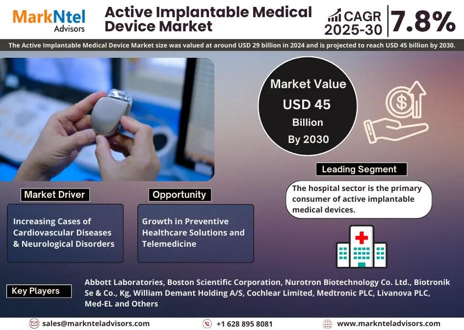 MarkNtel Advisors, a leading market research and consulting firm, has announced the release of its latest study titled Active Implantable Medical Device Market Research Report: Forecast (2025-2030). This report provides a detailed assessment of the Active Implantable Medical Device Market, covering its evolving dynamics, emerging trends, key growth drivers, major challenges, and competitive landscape.