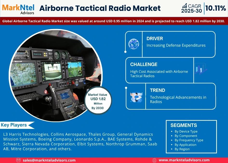 MarkNtel Advisors, a leading market research and consulting firm, has announced the release of its latest study titled Airborne Tactical Radio Market Research Report: Forecast (2025-2030). This report provides a detailed assessment of the Airborne Tactical Radio Market, covering its evolving dynamics, emerging trends, key growth drivers, major challenges, and competitive landscape.