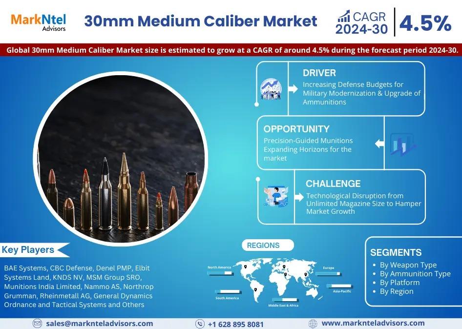MarkNtel Advisors, a leading market research and consulting firm, has announced the release of its latest study titled 30mm Medium Caliber Market Research Report: Forecast (2024-2030). This report provides a detailed assessment of the 30mm Medium Caliber Market, covering its evolving dynamics, emerging trends, key growth drivers, major challenges, and competitive landscape.