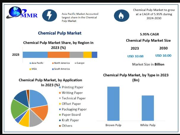 The Chemical Pulp Market was valued at approximately USD 10.68 billion in 2023 and is projected to reach around USD 16.00 billion by 2030, expanding at a CAGR of about 5.95% during the forecast period (2024–2030). Growth in the market is primarily supported by the rising demand for packaging paper, tissue, and specialty paper products, as well as increasing focus on sustainable and biodegradable materials in multiple end‑use industries. Chemical pulp is widely used to strengthen paper products and blend with mechanical pulp for enhanced quality applications.