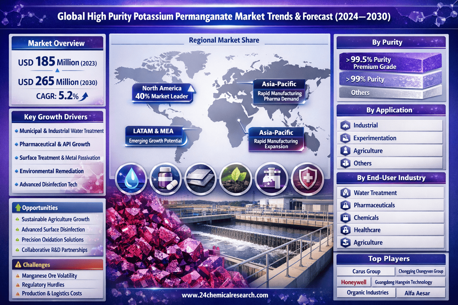 According to 24Chemical Research, Global High Purity Potassium Permanganate market was valued at USD 185 million in 2023 and is projected to reach USD 265 million by 2030, exhibiting a steady CAGR of 5.2% during the forecast period.