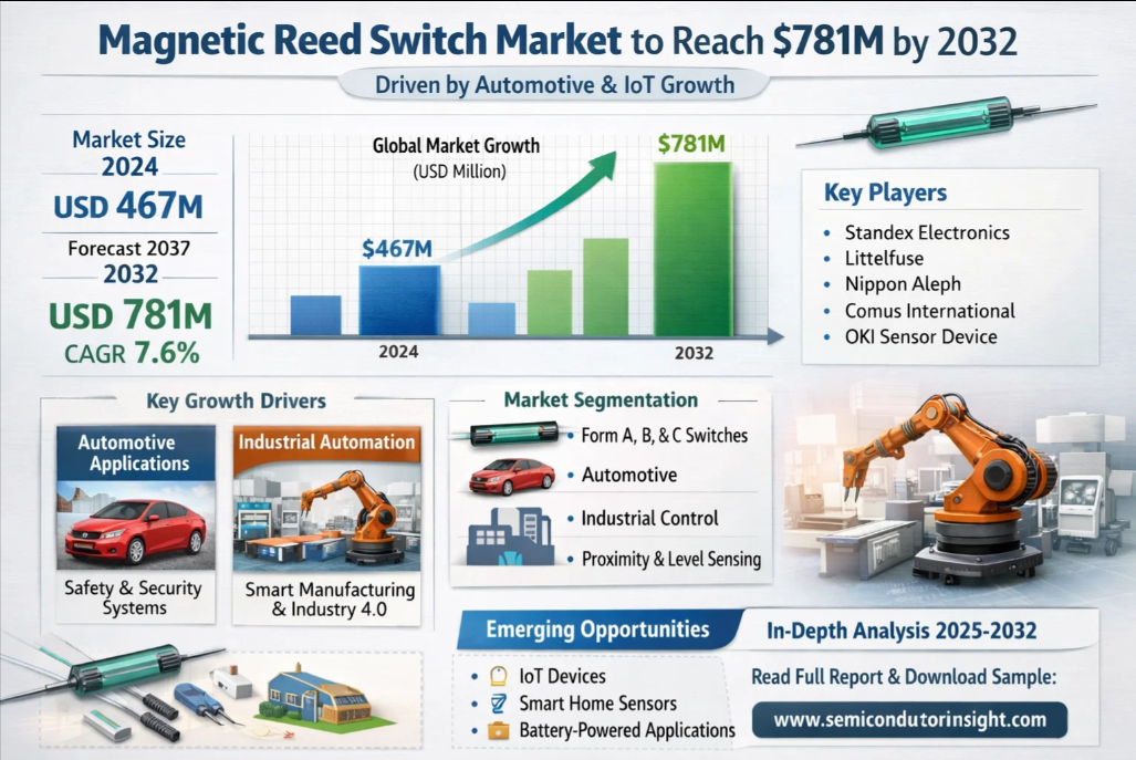 Magnetic Reed Switch Market to Hit $781M by 2034 Driven by Automotive & IoT Growth Global Magnetic Reed Switch Market, valued at a robust USD 467 million in 2024, is on a trajectory of significant expansion, projected to reach USD 781 million by 2032. This growth, representing a compound annual growth rate (CAGR) of 7.6%, is detailed in a comprehensive new report published by Semiconductor Insight. The study highlights the critical role of these reliable, hermetically sealed electromechanical switches in providing non-contact sensing across countless industries, particularly in automotive and industrial control systems. Read Full Report: https://semiconductorinsight.com/report/magnetic-reed-switch-market/ 🌐 Website: https://semiconductorinsight.com/ 📞 International: +91 8087 99 2013 🔗 LinkedIn: Follow Us #MagneticReedSwitch #SensorTechnology #IoTDevices #IndustrialAutomation #AutomotiveElectronics #SmartSensors #MarketGrowth #SemiconductorIndustry #Industry40 #Electromechanical #TechTrends #MarketResearch #Automation #SmartDevices #ElectronicsMarket·4 Прегледи ·0 Осврти