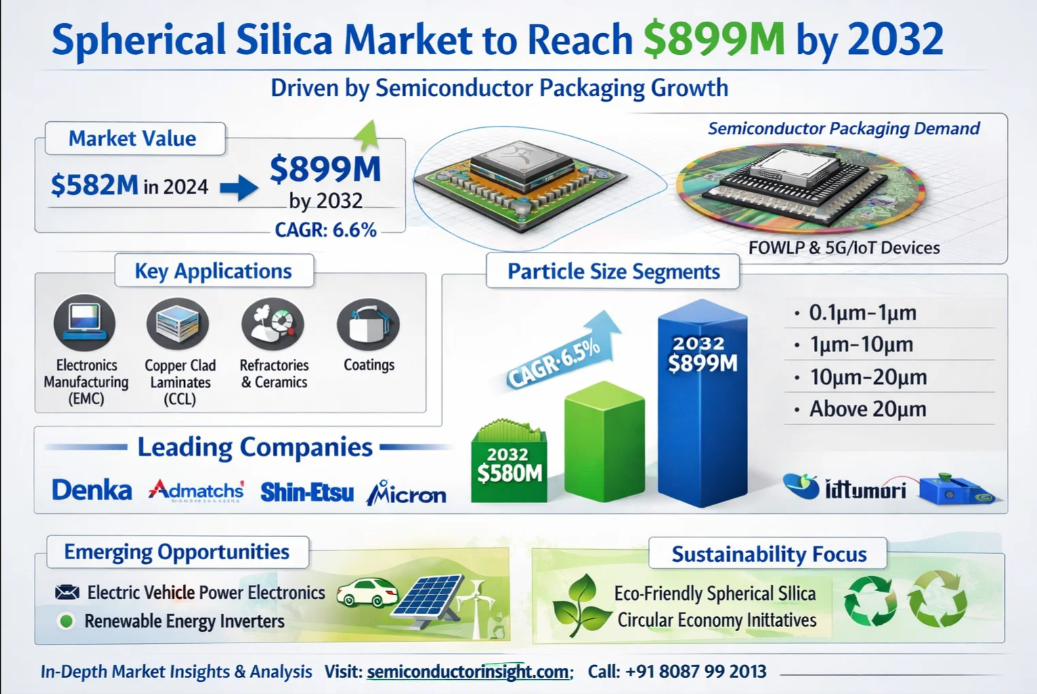 Spherical Silica Market to Hit $899M by 2034 Driven by Semiconductor Packaging Growth Global Spherical Silica Market, valued at USD 582 million in 2024, is poised for substantial growth, projected to reach USD 899 million by 2032, exhibiting a CAGR of 6.6% during the forecast period, as detailed in a comprehensive new report published by Semiconductor Insight. The study underscores the indispensable role of this high-performance material in achieving superior reliability and performance in electronic devices, particularly within the semiconductor packaging sector. 🌐 Website: https://semiconductorinsight.com/ 📞 International: +91 8087 99 2013 🔗 LinkedIn: Follow Us #SphericalSilica #SilicaMarket #SemiconductorIndustry #SemiconductorPackaging #ElectronicsManufacturing #MarketGrowth #TechMaterials #AdvancedMaterials #EMC #5GTechnology #IoTDevices #MarketResearch #IndustryTrends #SiliconMaterials #GlobalMarket·4 Прегледи ·0 Осврти -