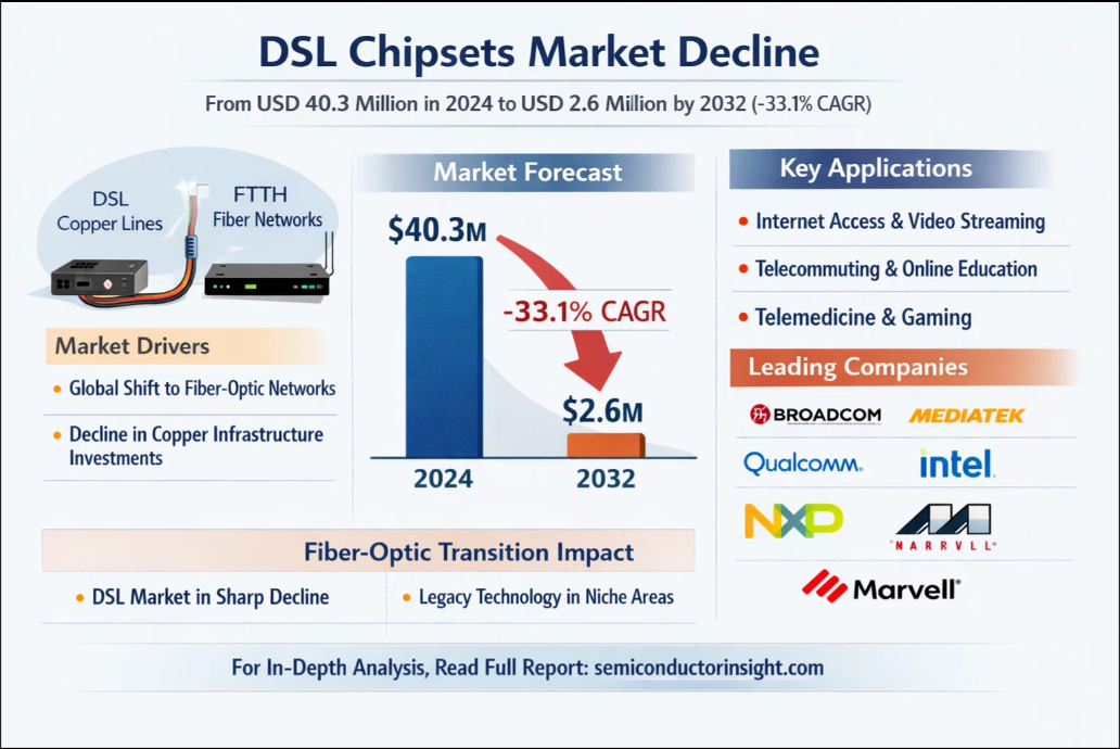 DSL Chipsets Market to Decline Sharply by 2034 Amid Global Shift to Fiber Networks Global DSL Chipsets Market, valued at USD 40.3 million in 2024, is projected to reach USD 2.6 million by 2032, exhibiting a negative compound annual growth rate (CAGR) of -33.1% during the forecast period. This significant market contraction is detailed in a comprehensive new report published by Semiconductor Insight. The study examines the declining role of this legacy connectivity technology in the face of the global transition to fiber-optic networks. 🌐 Website: https://semiconductorinsight.com/ 📞 International: +91 8087 99 2013 🔗 LinkedIn: Follow Us #DSLChipsets #FiberOptics #TelecomIndustry #SemiconductorMarket #Broadband #FTTH #MarketTrends #TechIndustry #DigitalTransformation #NetworkingTechnology #MarketResearch #Gfast #VDSL #FutureOfConnectivity·2 Прегледи ·0 Осврти