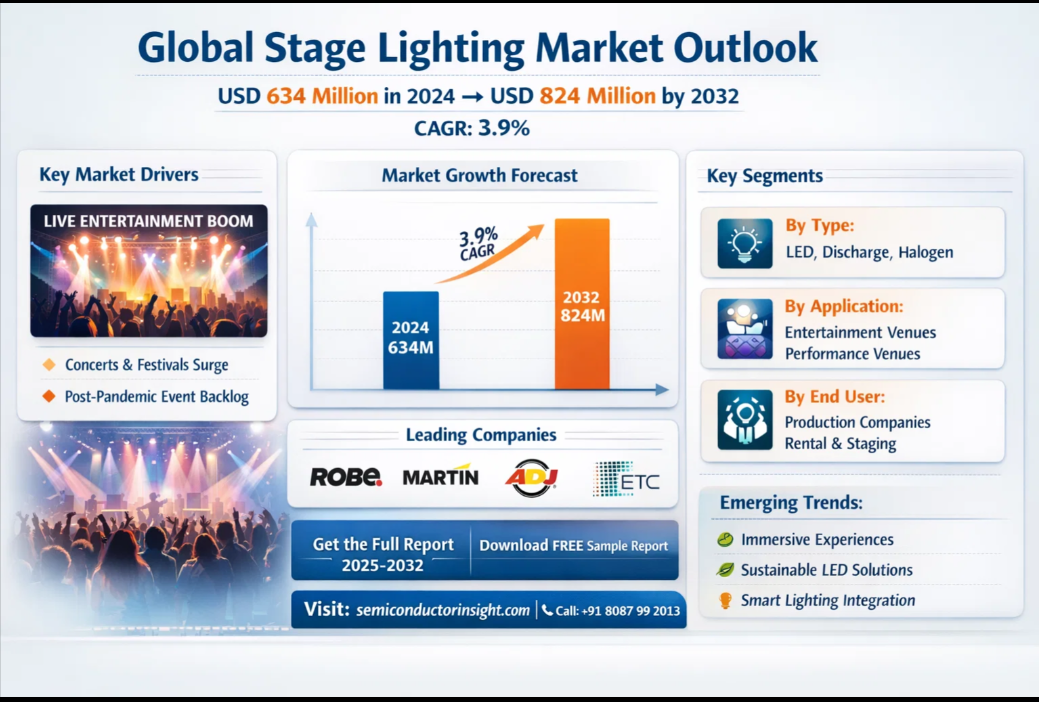 Stage Lighting Market to Hit $824M by 2034 | LED Growth & Live Events Boom Drive Demand Global Stage Lighting Market was valued at a solid USD 634 million in 2024, and is now on a consistent growth path, projected to reach USD 824 million by 2032. This sustained expansion, representing a compound annual growth rate (CAGR) of 3.9%, is detailed in a comprehensive new report published by Semiconductor Insight. The study underscores the essential function of these sophisticated illumination systems in elevating the production value and immersive quality of live events and performances worldwide. 🌐 Website: https://semiconductorinsight.com/ 📞 International: +91 8087 99 2013 🔗 LinkedIn: Follow Us #StageLighting #LightingMarket #LEDLighting #LiveEvents #EntertainmentIndustry #MarketGrowth #LightingTechnology #EventProduction #SmartLighting #CAGR #MarketTrends #SemiconductorInsight